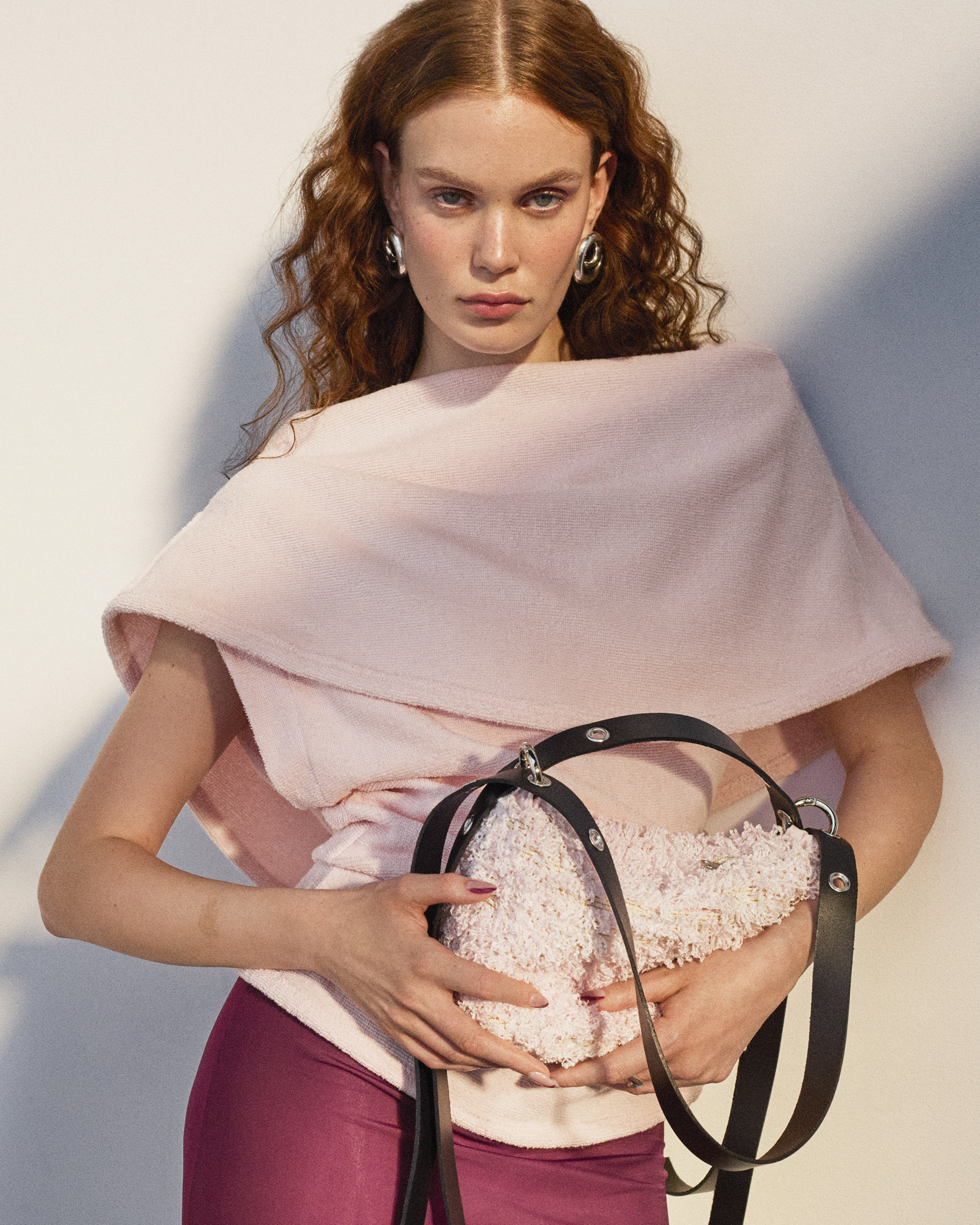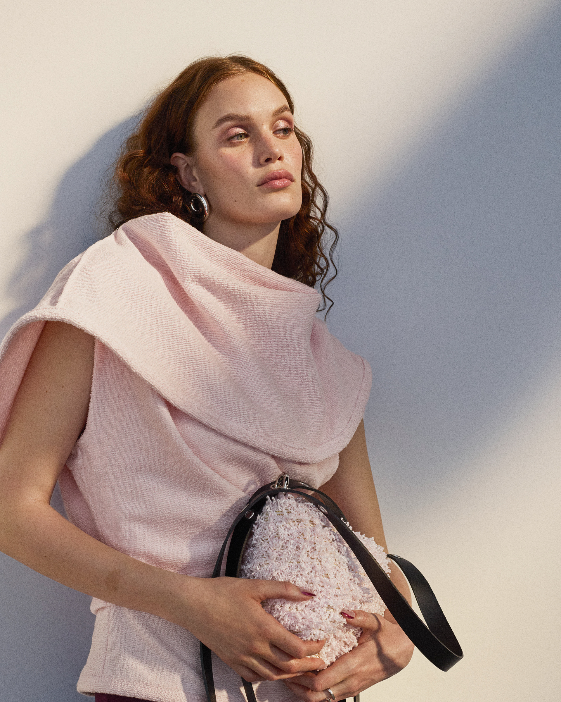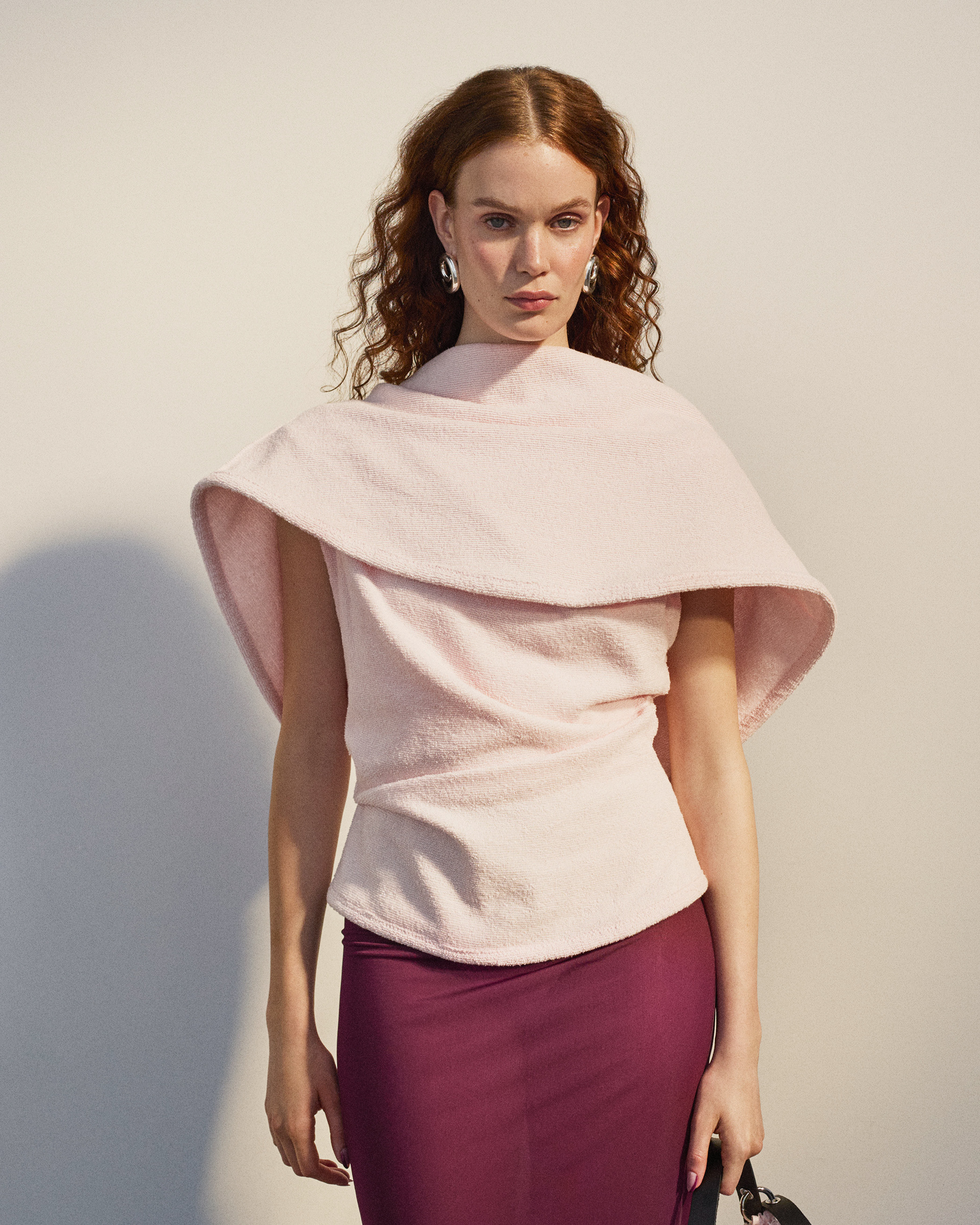 The pink towel top features an asymmetrical cut and a wide collar. It buttons down the back, opening completely.
