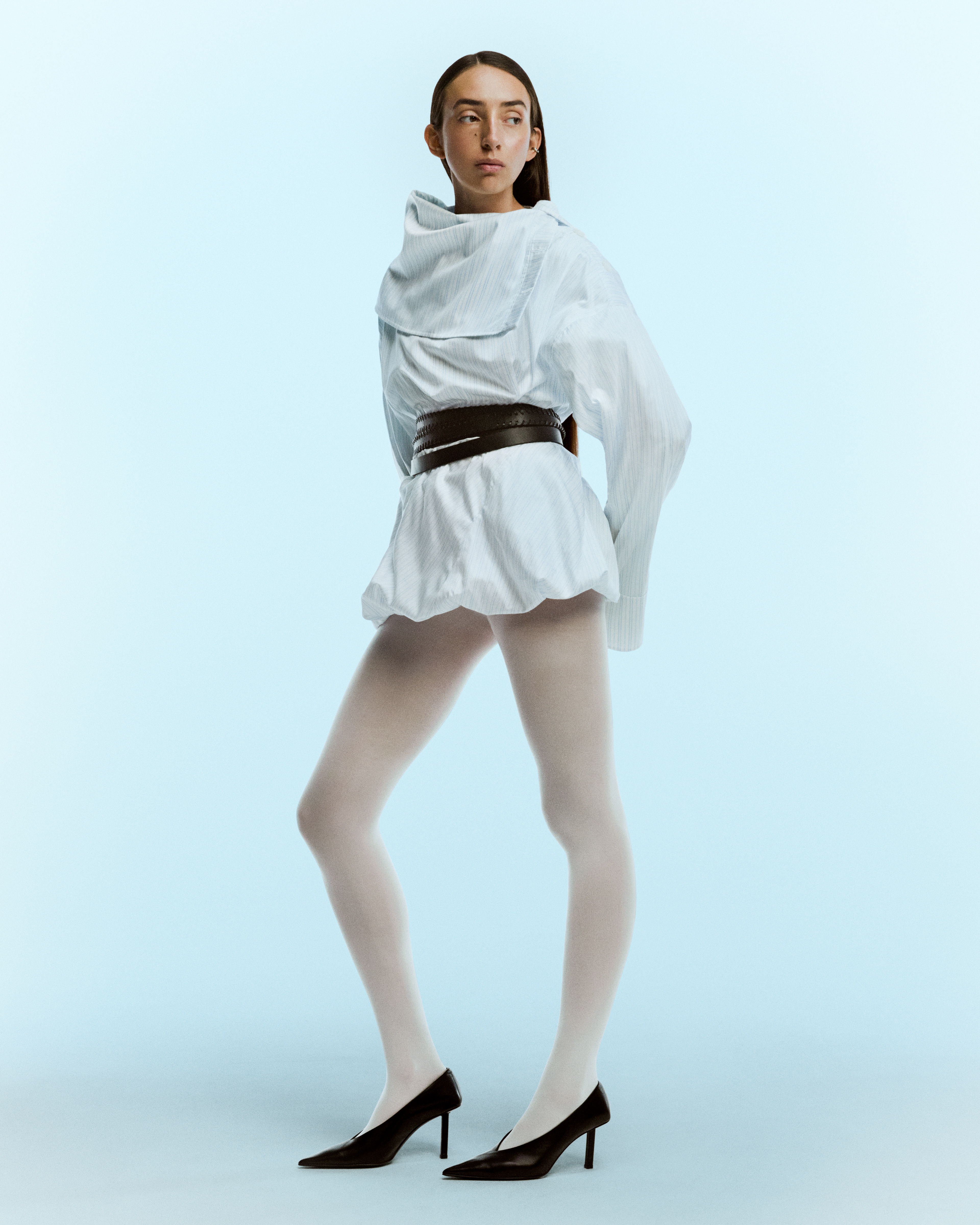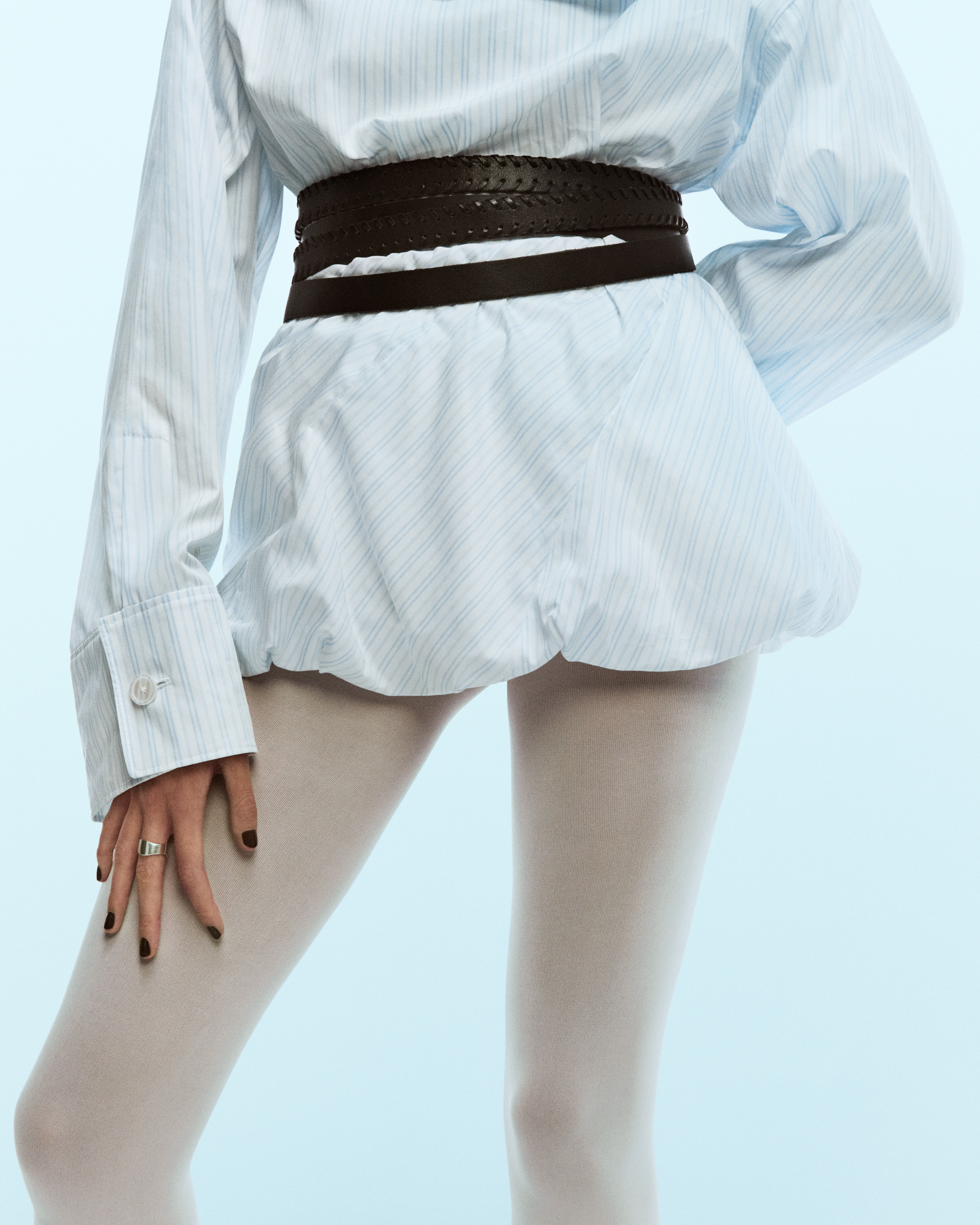 The blue striped balloon skirt is crafted from a luxurious deadstock 100% cotton fabric sourced from Italy, featuring a subtle yet sophisticated sheen, complemented by a soft jersey underskirt.