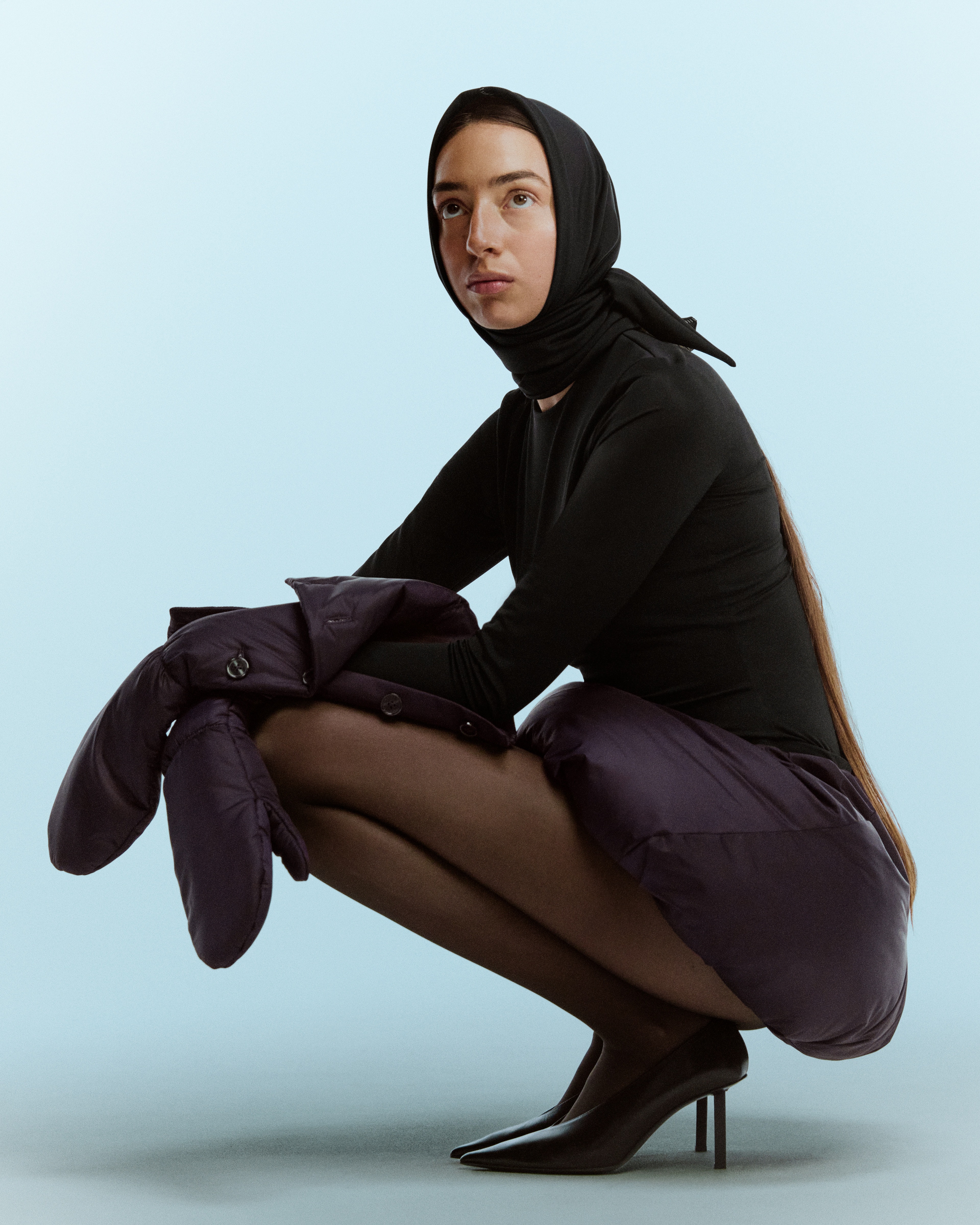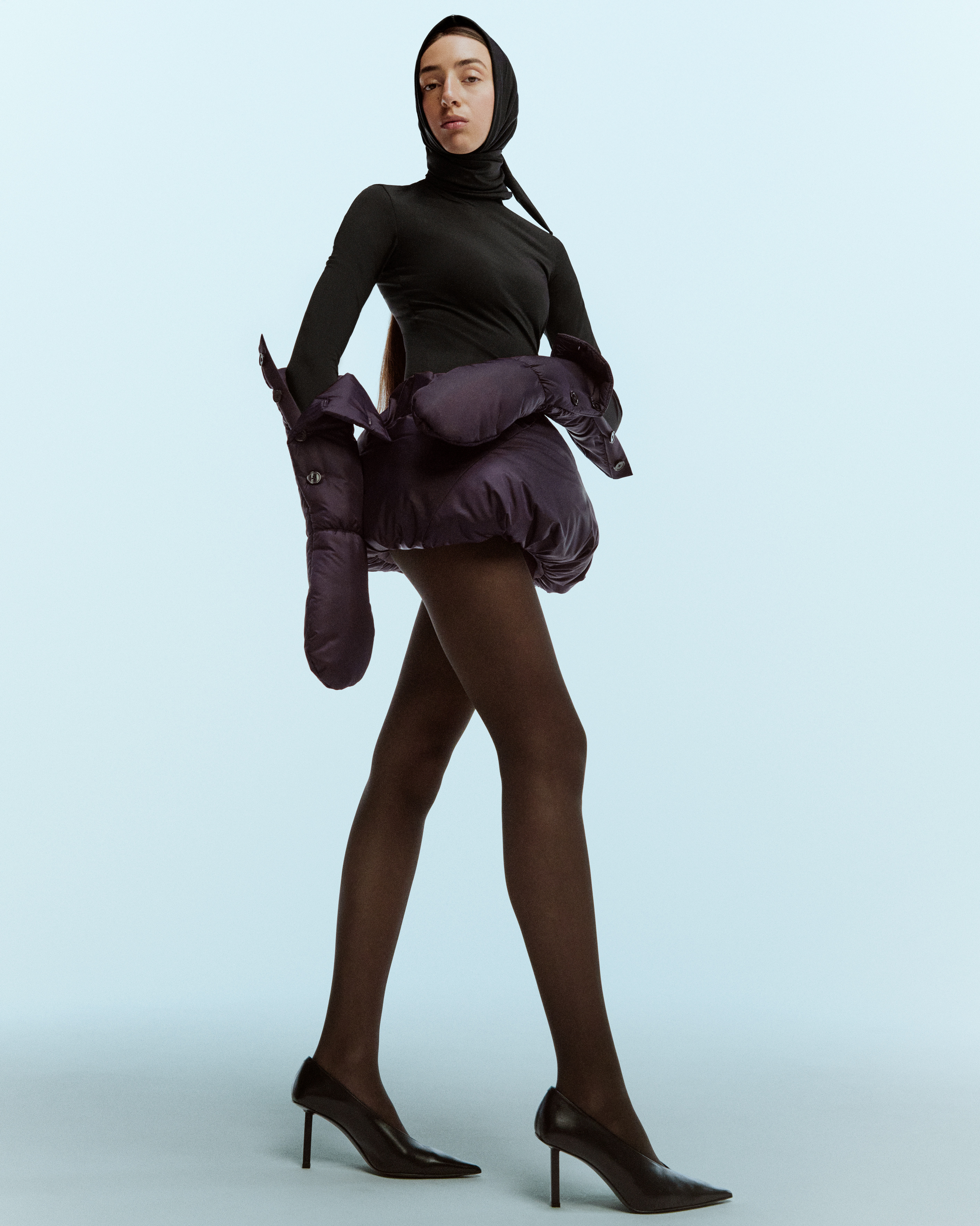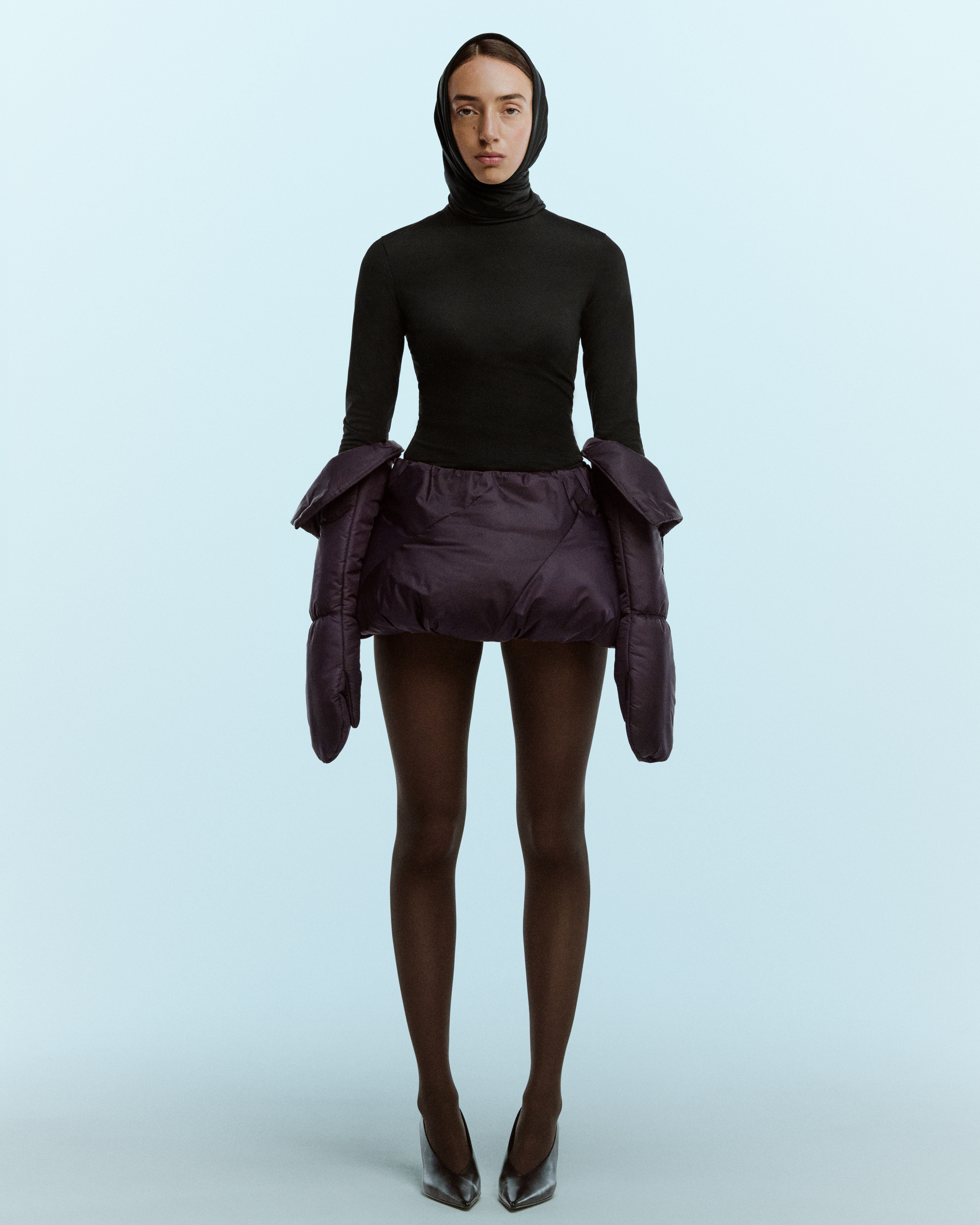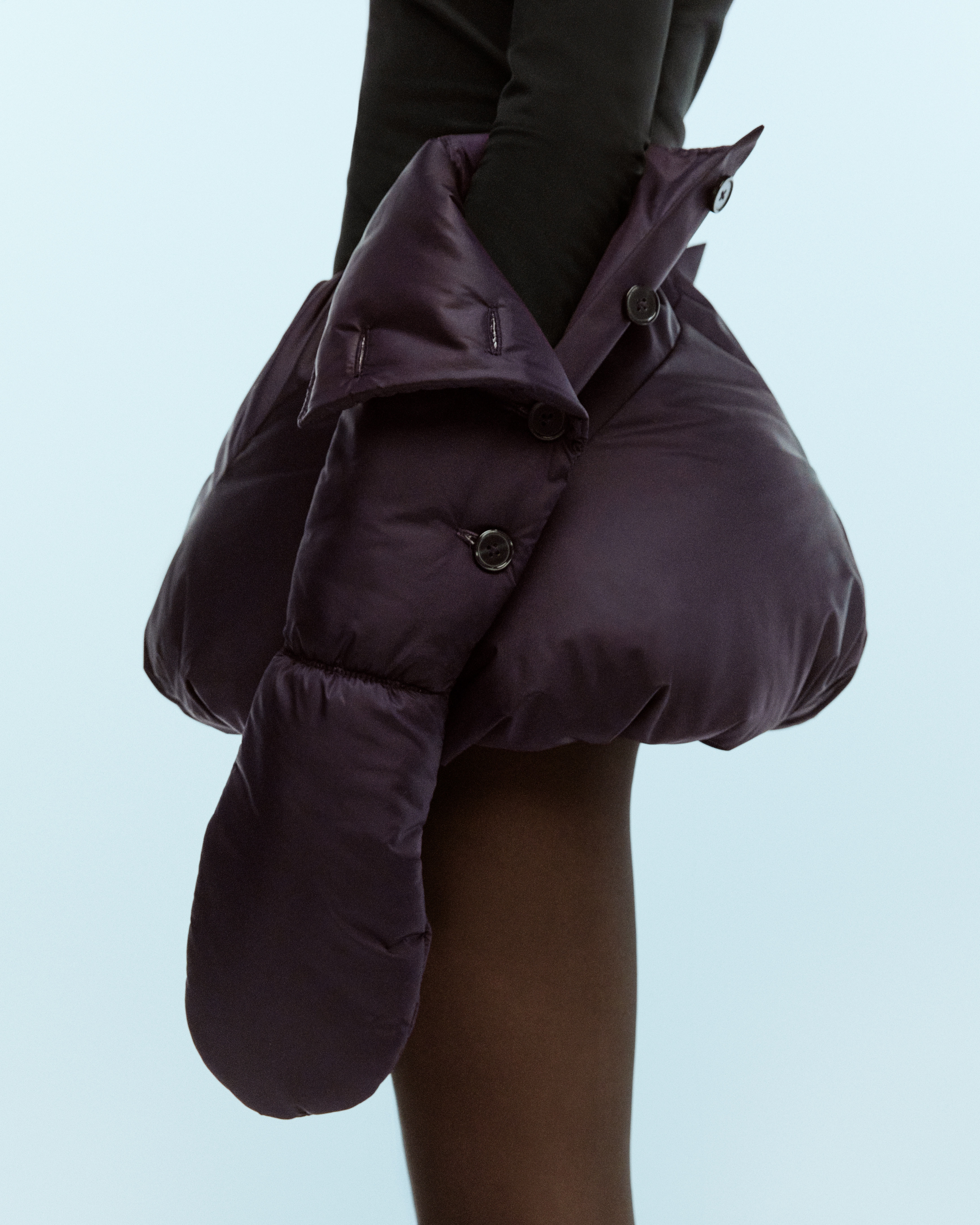 The plum balloon skirt is crafted from a lustrous nylon fabric in a rich plum hue, complemented by a soft jersey underskirt. It’s filled with plush polyester padding for a voluminous fit.