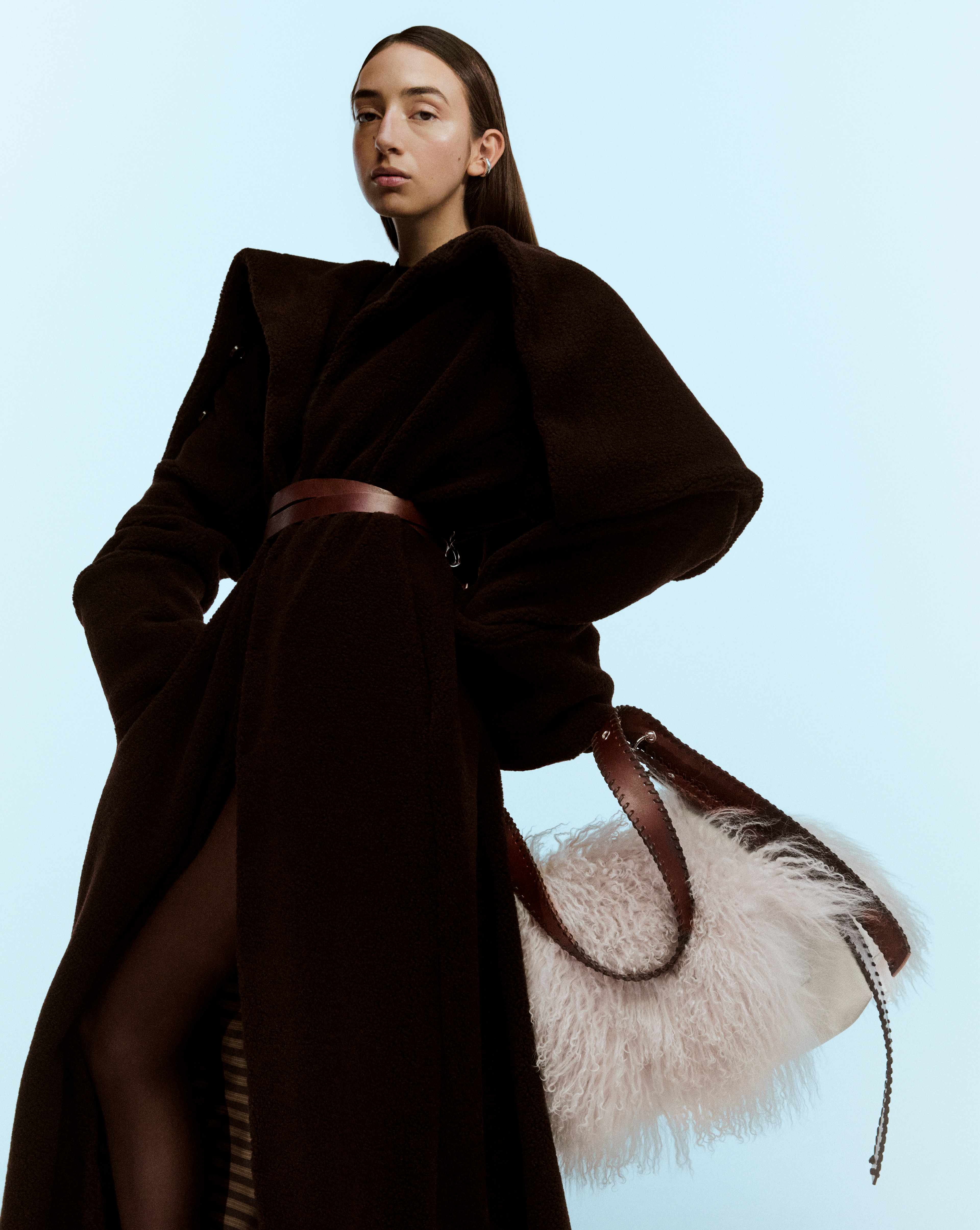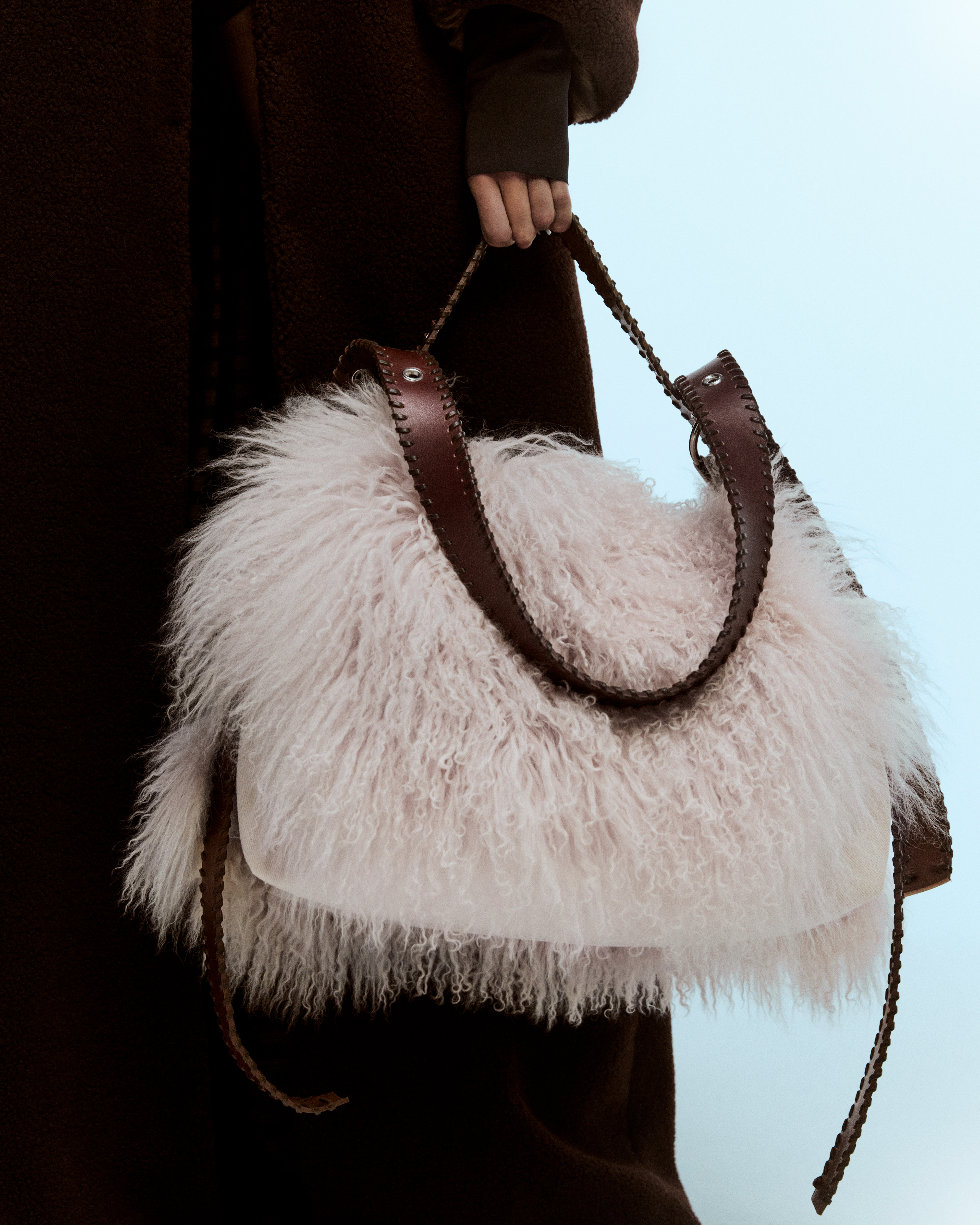 The pink fluffy bag is made from durable canvas fabric, featuring removable pink sheepskin panels on both sides, secured with buttons. It also has adjustable braided brown leather handles, woven with delicate leather strands.