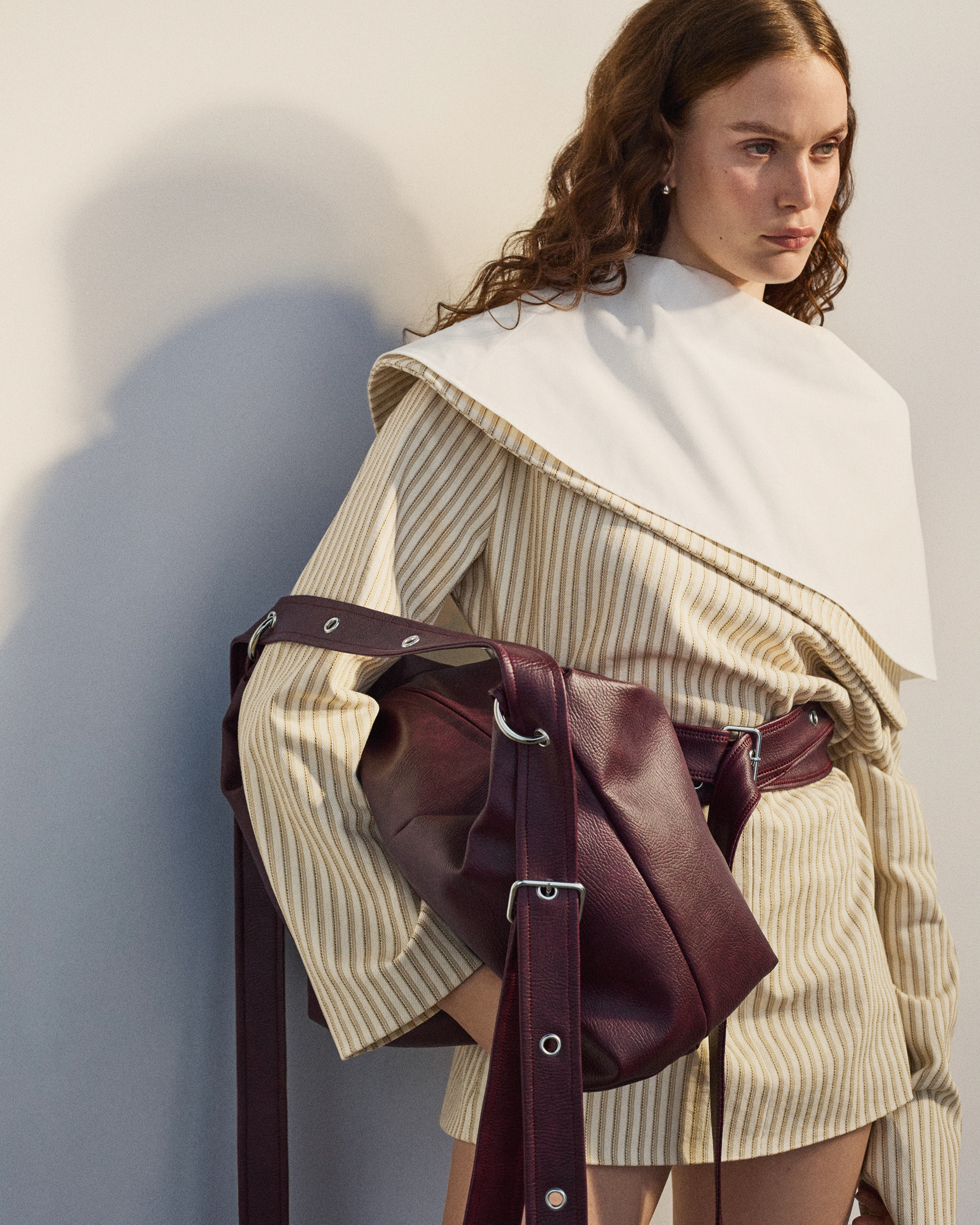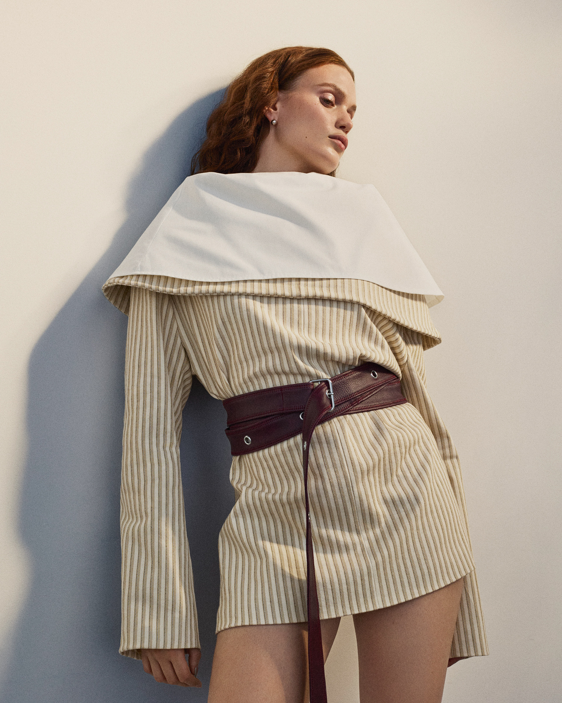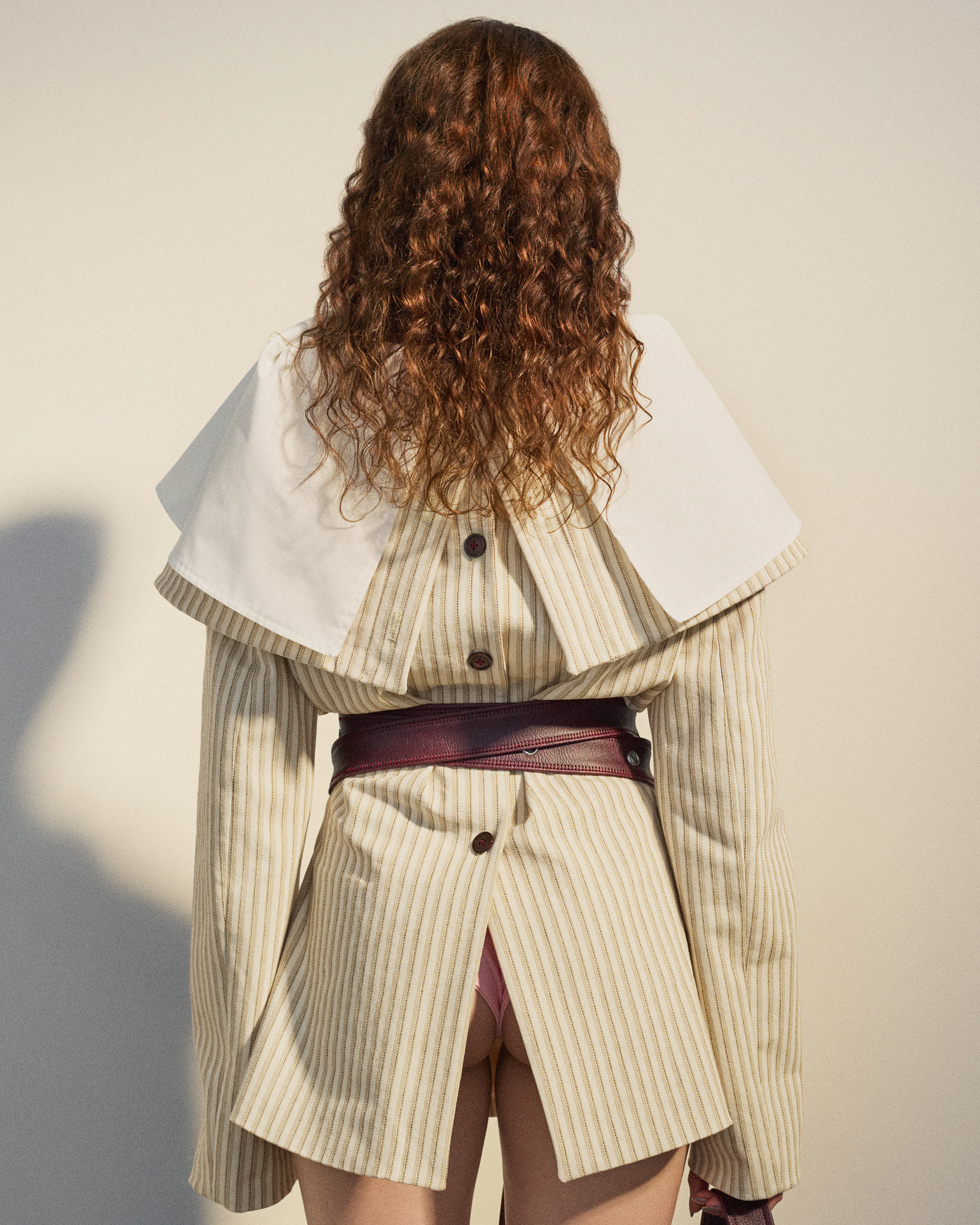 The beige stripe blazer is a tailored piece with a slim, fitted waist and an oversized double collar layered with cotton shirt fabric. It features a full-length button closure along the center back that opens completely.