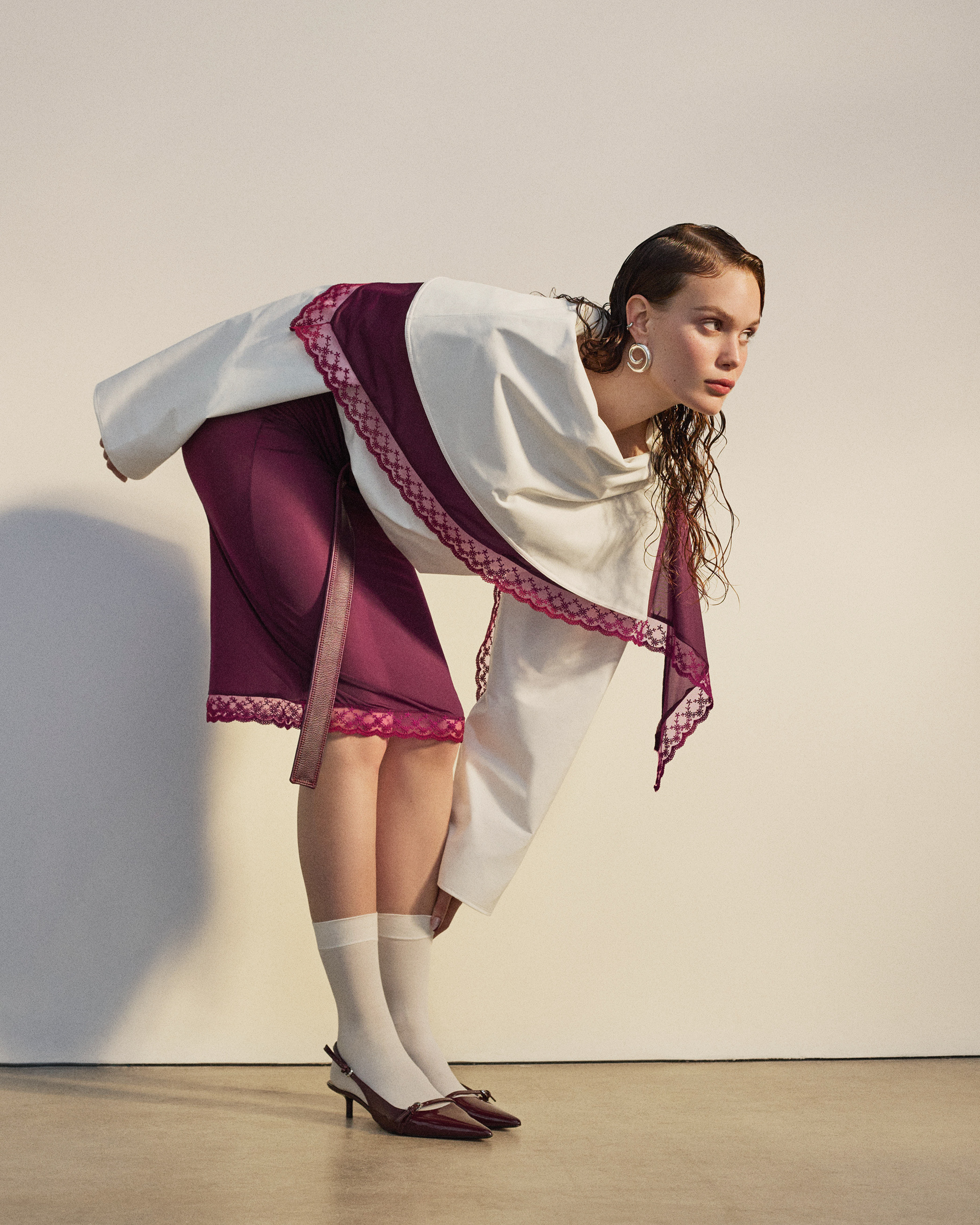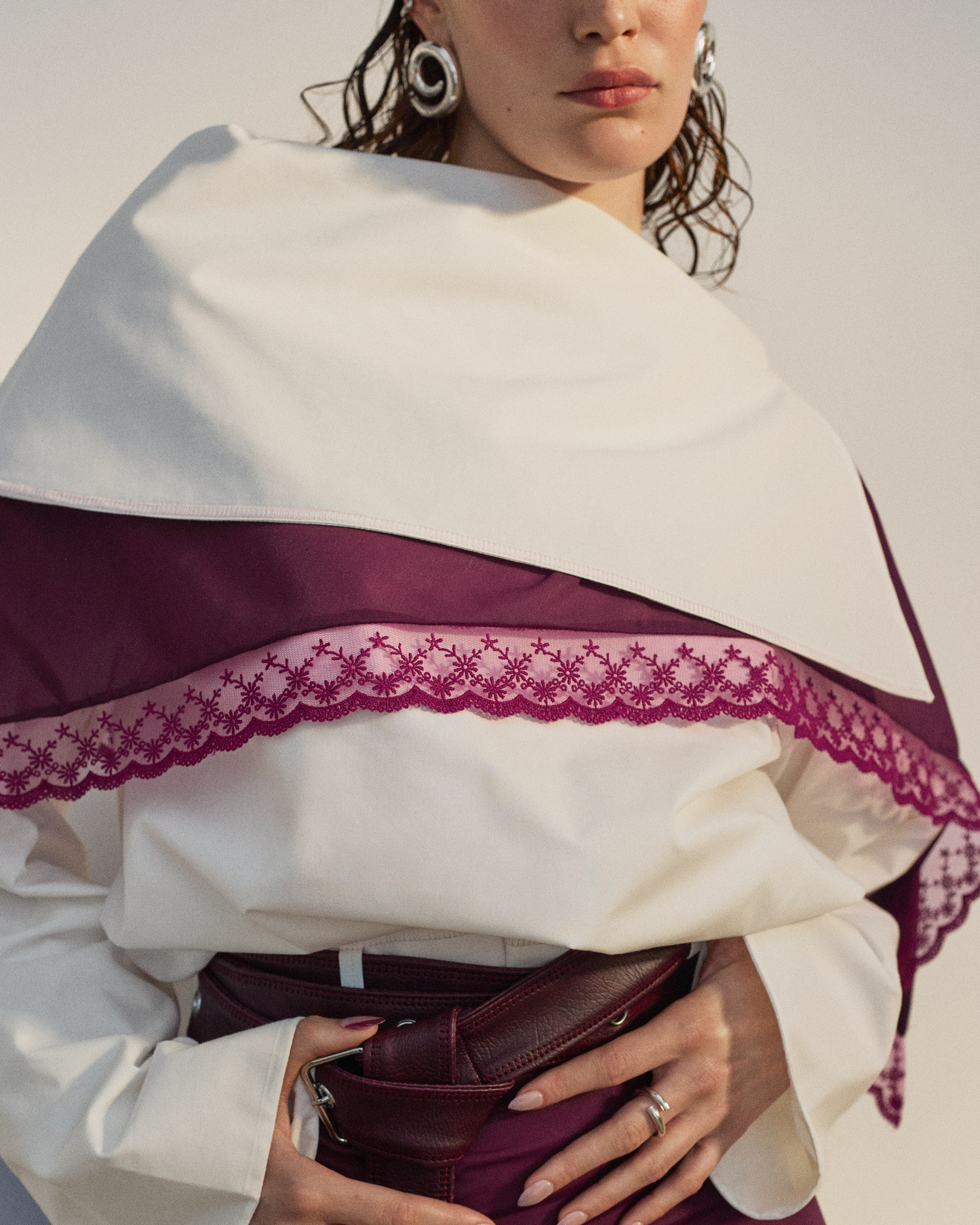 The white asymmetric shirt is an oversized cotton piece featuring an elongated collar accented with pink topstitching. Belt loops at the hem allow it to be styled with a belt for a more defined silhouette.