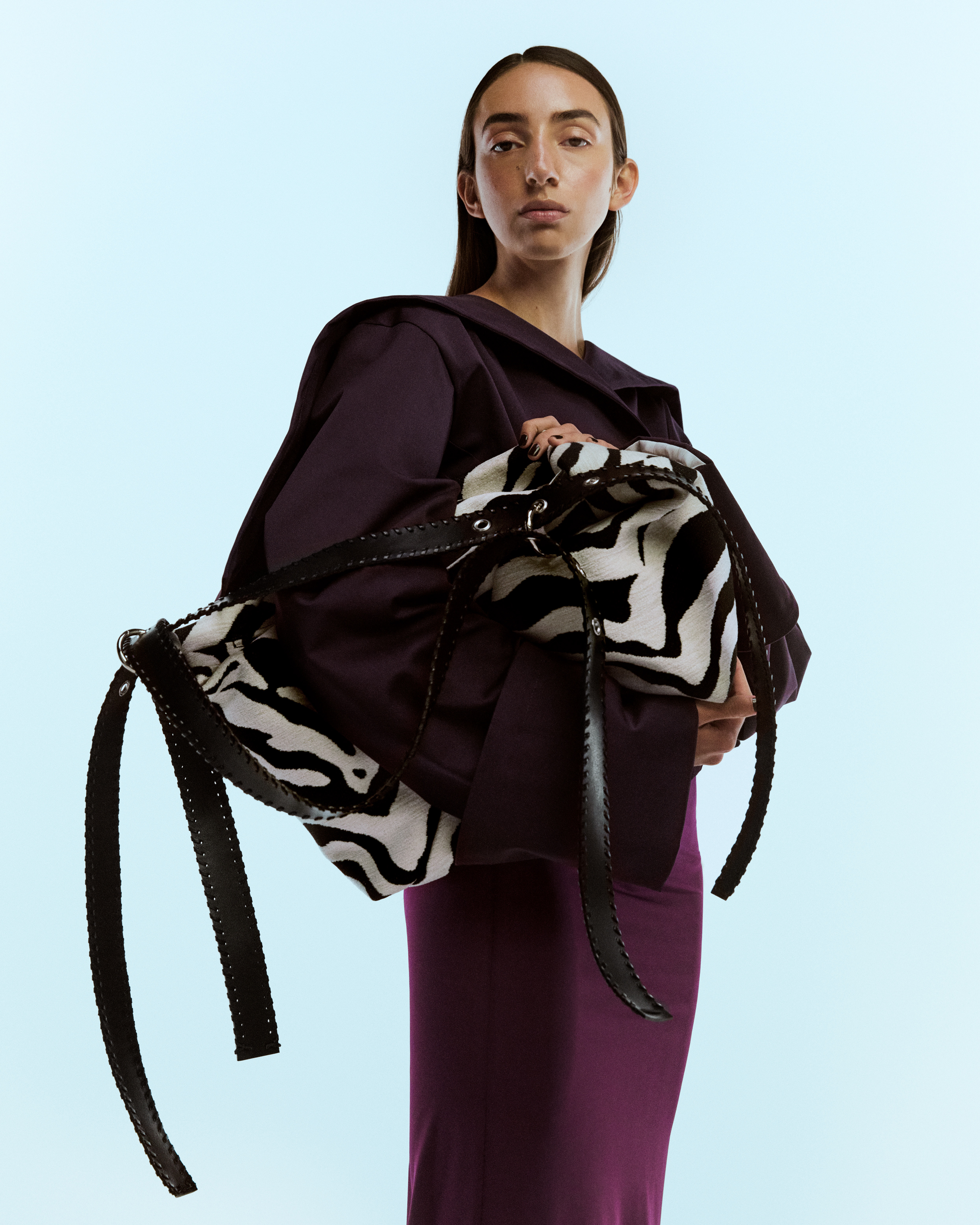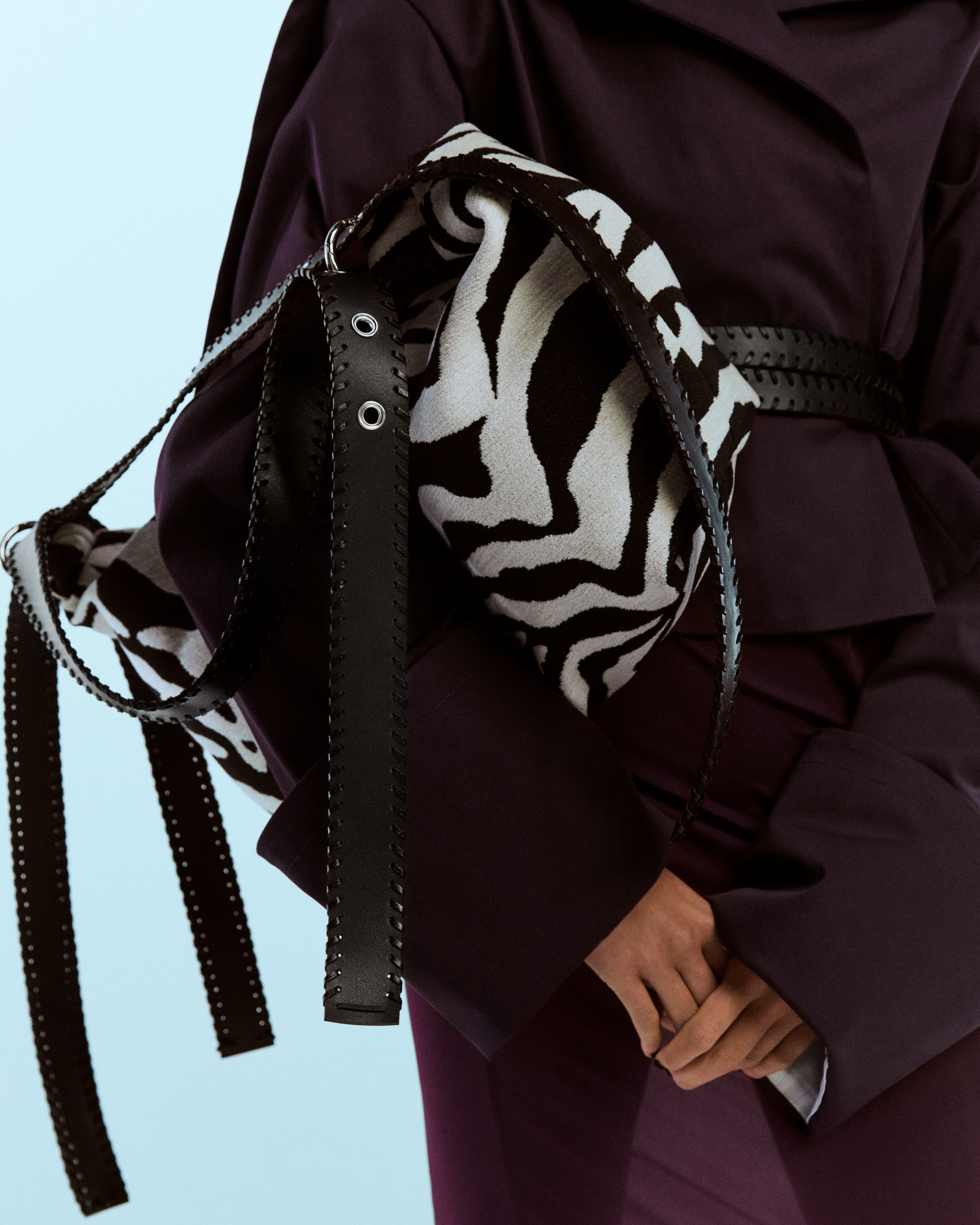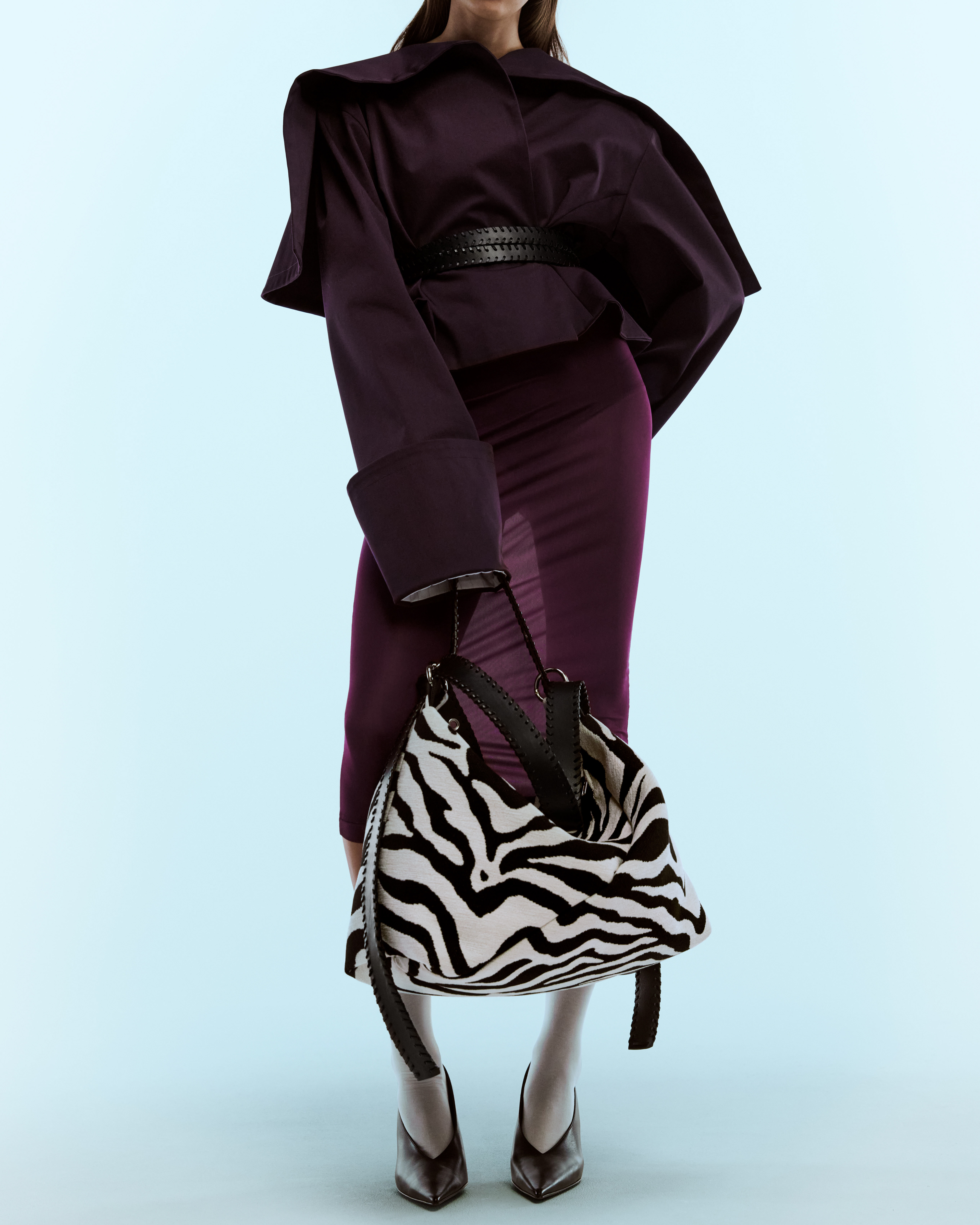 The zebra bag is crafted from a luxurious cotton fabric with a zebra pattern. It has adjustable braided black leather handles, woven with delicate leather strands.