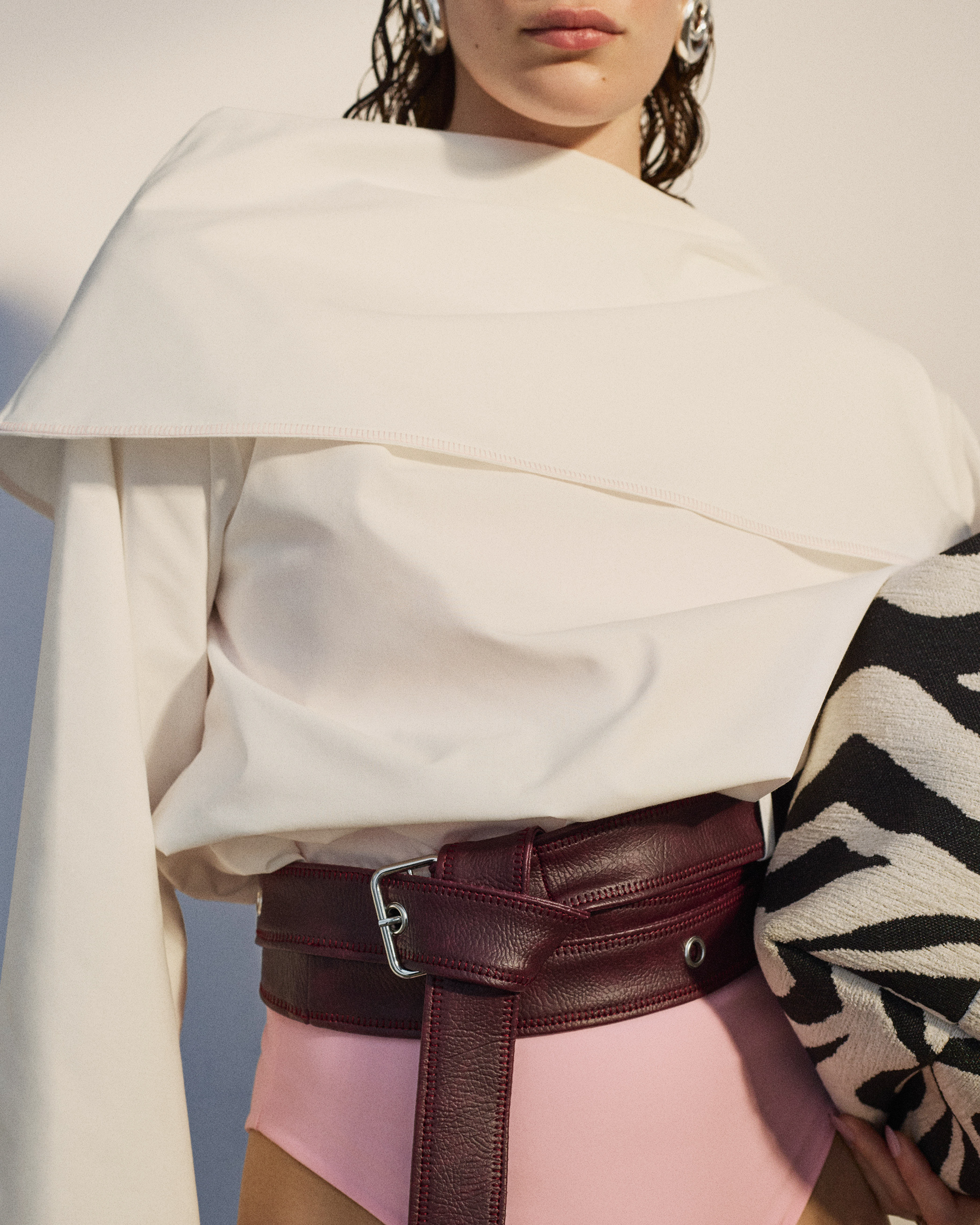 The burgundy long belt is 3 meters long to be able to wrap multiple times around waist. It features a silver metal buckle.
